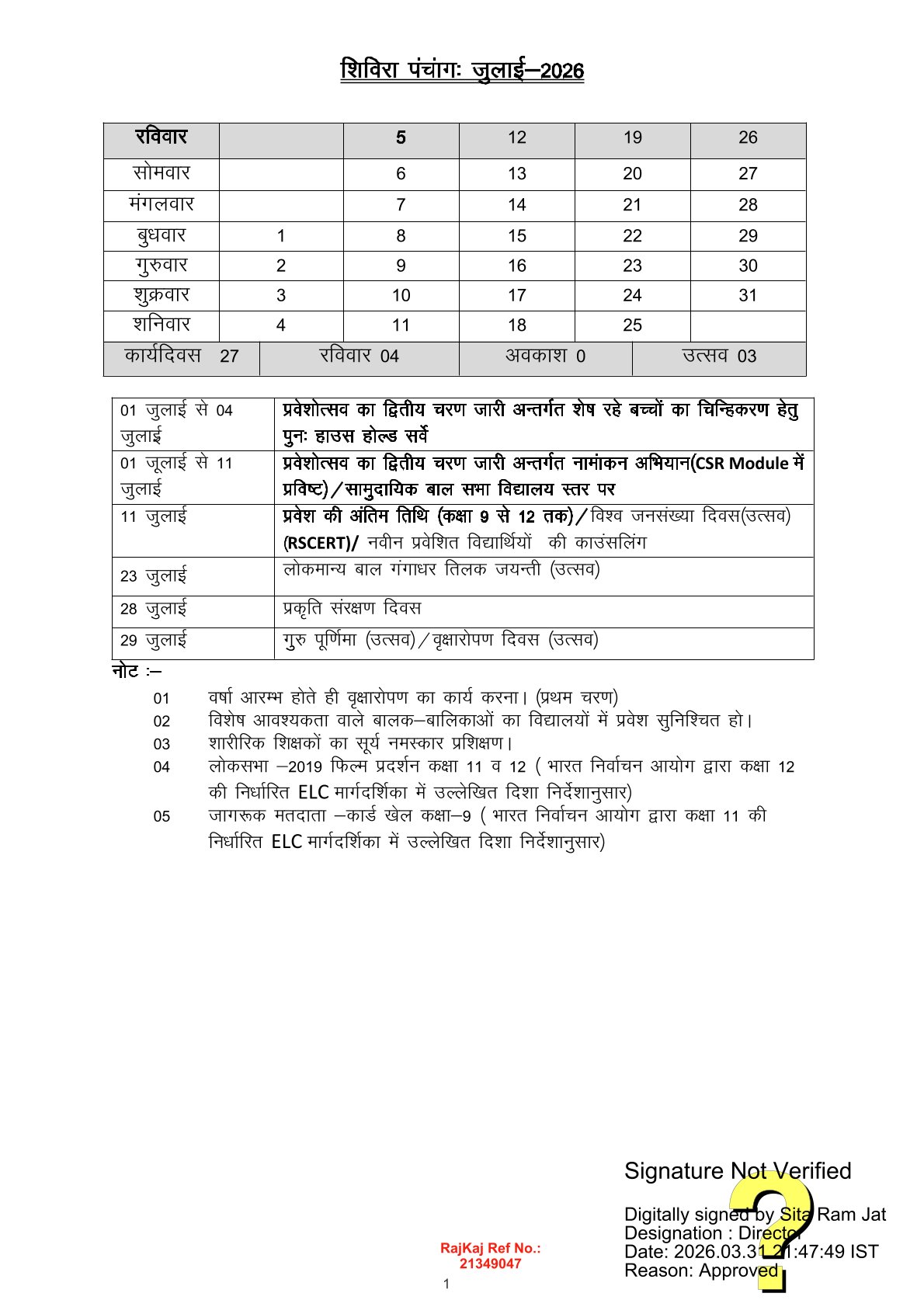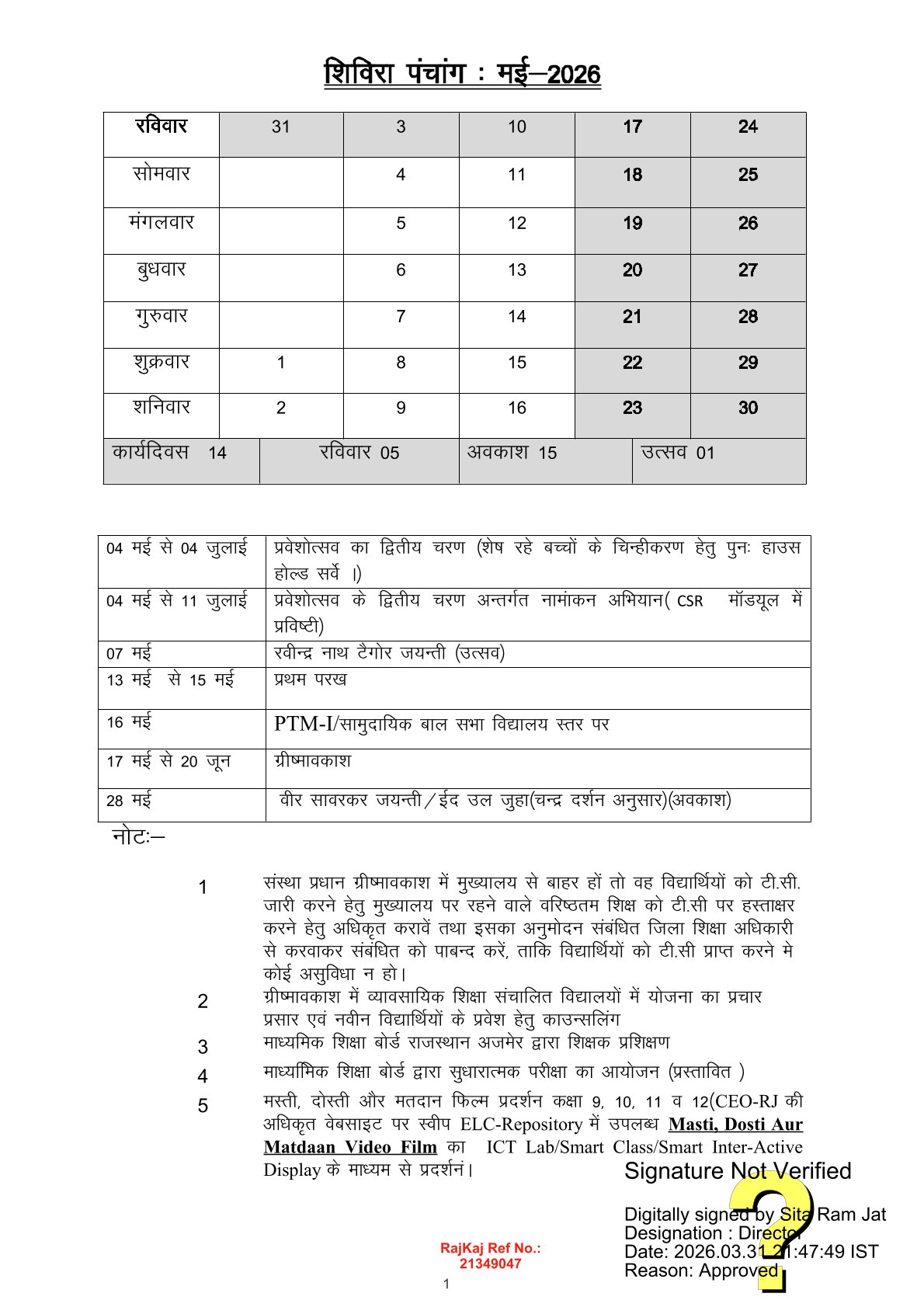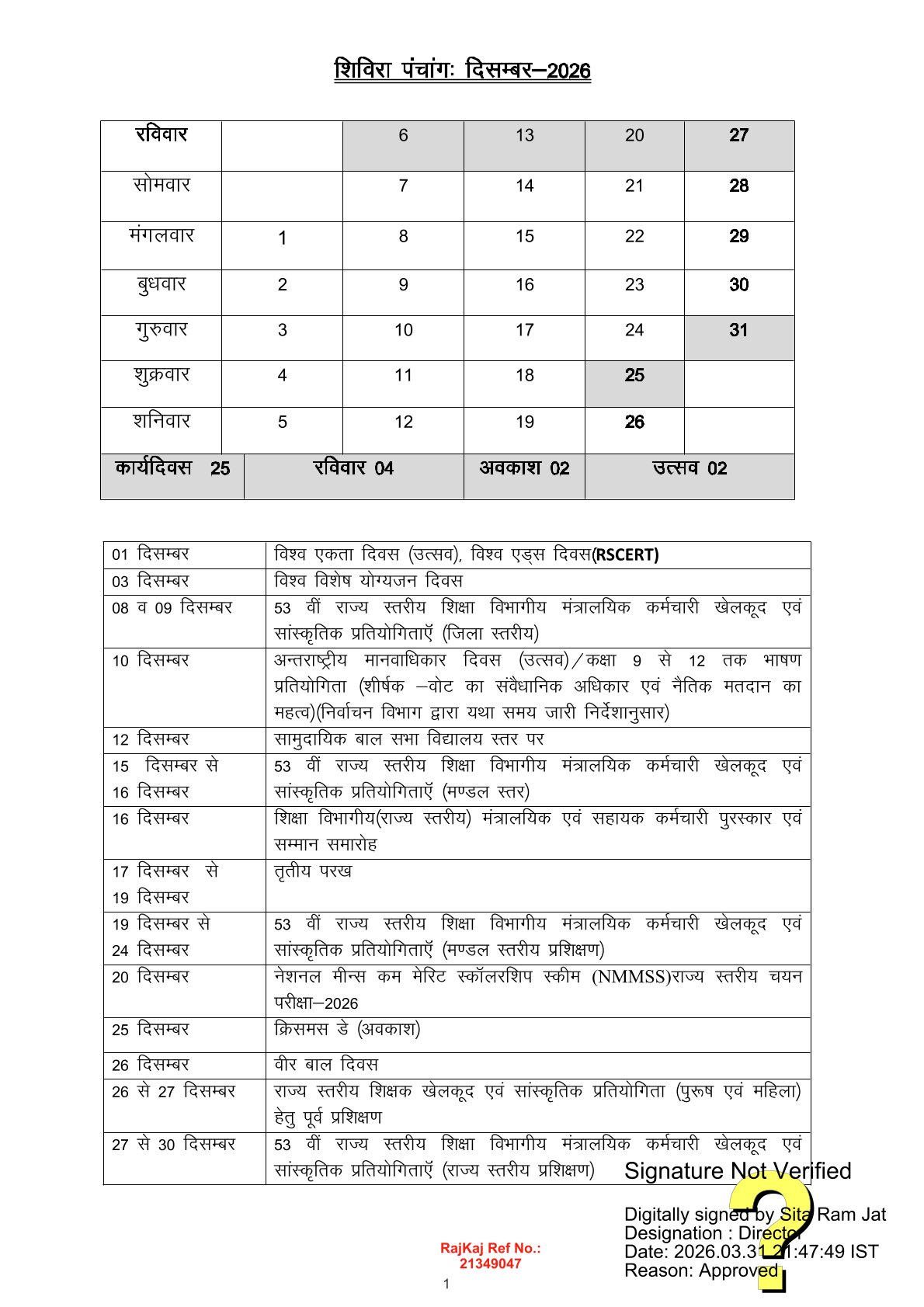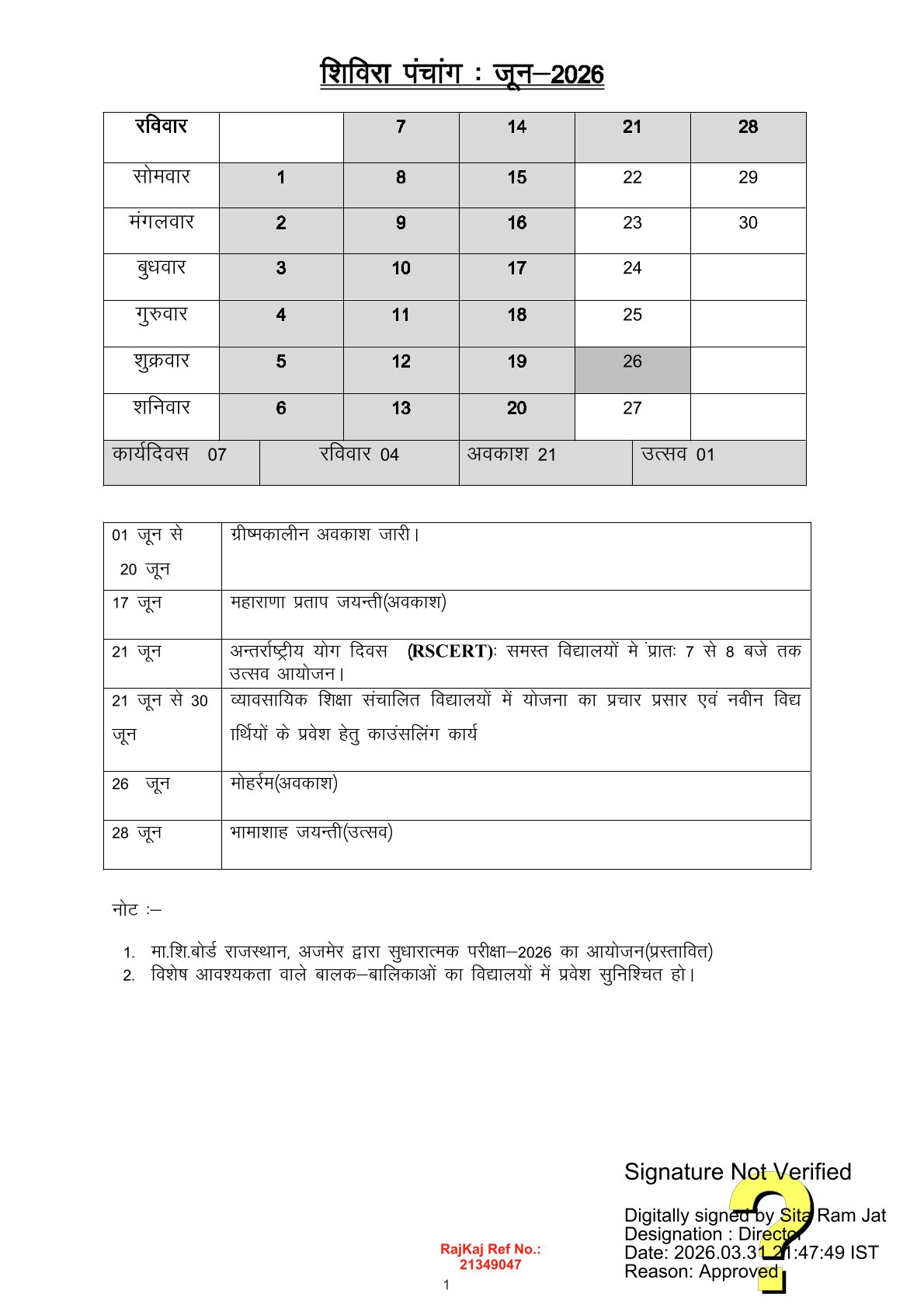 नोट: यह कैलेंडर शिविरा पंचांग 2026-27 के सामान्य दिशा-निर्देशों पर आधारित एक डिजिटल संस्करण है। किसी भी विवाद या राजकीय अवकाश में परिवर्तन की स्थिति में शिक्षा विभाग द्वारा जारी मूल आधिकारिक आदेश (Original Order) ही अंतिम व मान्य होगा।